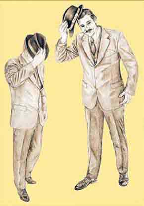 As he walks along he ‘tips’ his hat to a passing lady which traditionally was a sign of respect, greeting or acknowledgment