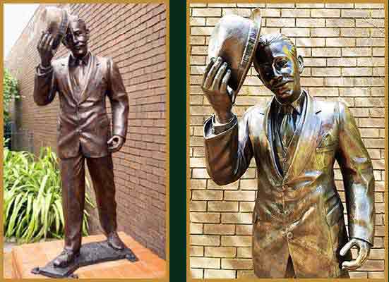 The statue of a man Tipping the Denton Linney Hat was the second of six commissioned bronze statues produced by Escar UK Bronze for Greater Manchester Council, England