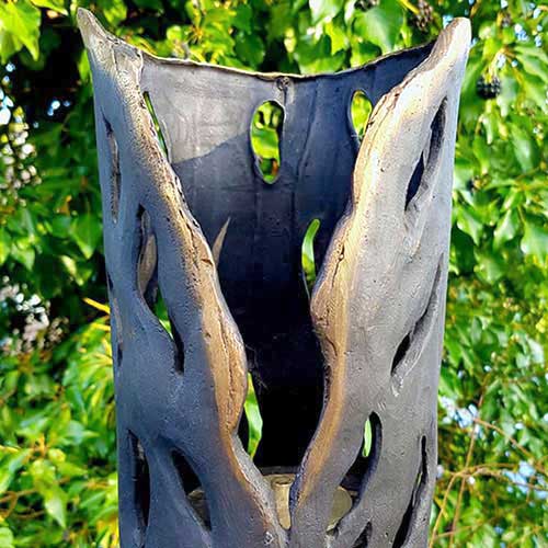 With dimensions of 24cm high x 14cm round, the carefully chosen patination of brown enhances the lamp’s visual appeal and adds depth and character to its cylindrical design