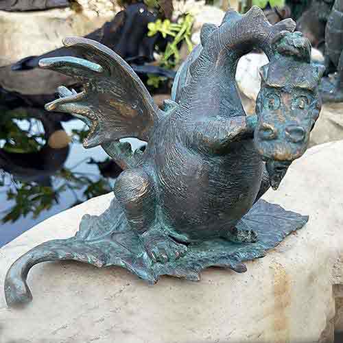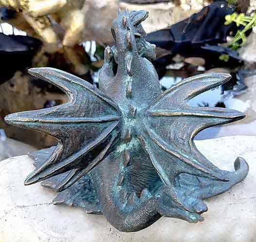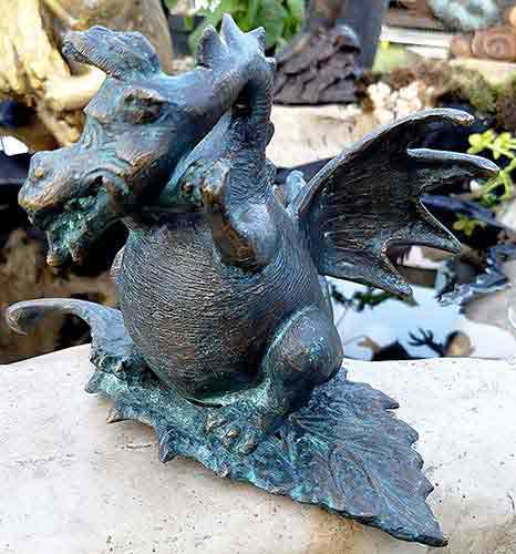 The Drusilla Dragon on a Leaf Water Feature is a truly unique and eye-catching addition to any garden and the brown and blue patination with highlights, accentuates the intricate details of the dragon’s form, adding further to its charm and character